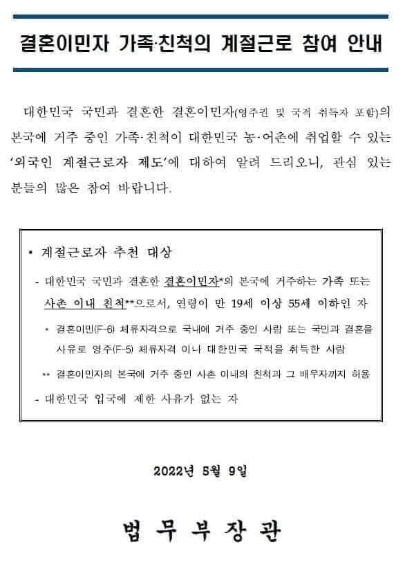 자유게시판 결혼 이민자의 가족, 친척 계절근로 참여 안내 작성자 Lv8 몽골곰 작성일 2022-05-18 00:13 조회 6392 몽골은 아직 해당 내용 적용 안됨. 좋아요 0 싫어요 0 인쇄 전체 1 추천순 작성순 최신순 레인메이커 2022-05-18 14:29 정해진 나라가 있는가봐요? 좋아요 0 싫어요 0 댓글을 남기려면 로그인하세요. 소셜 로그인 « 몽골 주요 온천, 요양원 연락처 자연, 역사 박물관 개관 » 목록보기 전체 2,539 최신순 추천순 조회순 업데이트순 전체 가입인사 몽골여행 여행후기 갔다왔어(몽골장소) 몽골생활 사업/근로in몽골 몽골어 한몽남녀 연예/방송/유머/짤방/좋은글 정치/경제/사회/국제 기타 전체 가입인사 몽골여행 여행후기 갔다왔어(몽골장소) 몽골생활 사업/근로in몽골 몽골어 한몽남녀 연예/방송/유머/짤방/좋은글 정치/경제/사회/국제 기타 번호 제목 작성자 작성일 추천 조회 공지사항 귀국정리 물건 처분 관련 사기 조심 하몽컨텐츠팀 | 2024.06.17 | 추천 0 | 조회 36683 하몽컨텐츠팀 2024.06.17 0 36683 공지사항 저희 커뮤니티 성격과 동떨어진 광고 게시글은 경고없이 삭제됩니다. 하몽컨텐츠팀 | 2022.10.05 | 추천 1 | 조회 44039 하몽컨텐츠팀 2022.10.05 1 44039 공지사항 게시판별 활용 및 작성방법 + 게시판 공통규정 하몽운영팀K | 2020.04.27 | 추천 0 | 조회 25521 하몽운영팀K 2020.04.27 0 25521 2536 육가공 업체 운영하시는 사장님 계시면 연락주세요 Lv1 sangheoni2003@gmail.com | 2025.12.11 | 추천 0 | 조회 134 Lv1 sangheoni2003@gmail.com 2025.12.11 0 134 2535 ☝️교민들이 가장 많이 묻는 ‘한국어교원 2급’ 핵심 Q&A Lv1 선교육 | 2025.12.08 | 추천 0 | 조회 182 Lv1 선교육 2025.12.08 0 182 2534 텔레미어 몽골 지사 모집 Lv1 Richard | 2025.12.05 | 추천 0 | 조회 224 Lv1 Richard 2025.12.05 0 224 2533 안녕하세요. 건축자재(자착식 방수시트) 및 원재료 부틸컴파운드 수입 업체 찾습니다. Lv1 가미소재 | 2025.12.04 | 추천 0 | 조회 213 Lv1 가미소재 2025.12.04 0 213 2532 코리언 디저트카페 Dessert39 몽골 2호점 오픈 (3) Lv2 경광호 | 2025.12.03 | 추천 1 | 조회 264 Lv2 경광호 2025.12.03 1 264 2531 한국–몽골 공익 협력의 첫걸음, 함께하실분을 모집합니다!! (1) Lv1 한국몽골발전연대 | 2025.12.02 | 추천 0 | 조회 269 Lv1 한국몽골발전연대 2025.12.02 0 269 2530 한국거주하신 몽골인 주방후드제작 직원구합니다. Lv1 서울공조닥트 | 2025.11.27 | 추천 0 | 조회 268 Lv1 서울공조닥트 2025.11.27 0 268 2529 몽골 시장 개척 Lv1 thekhaon | 2025.11.26 | 추천 0 | 조회 314 Lv1 thekhaon 2025.11.26 0 314 2528 텔레미어 몽골진출사업 도와주실 협력파트너 모집 Lv1 Richard | 2025.11.10 | 추천 0 | 조회 388 Lv1 Richard 2025.11.10 0 388 2527 ⭐전 세계 한국어 수요 폭발 → 한국어교원 2급 준비생 모집 (선착순)⭐ Lv1 선교육 | 2025.11.10 | 추천 0 | 조회 382 Lv1 선교육 2025.11.10 0 382 2526 한국 거주 몽골어 통역사 Lv1 노민 | 2025.11.10 | 추천 0 | 조회 373 Lv1 노민 2025.11.10 0 373 2525 몽골 여행 가이드 해드립니다! Lv2 주크 | 2025.11.01 | 추천 0 | 조회 480 Lv2 주크 2025.11.01 0 480 2524 ⚙️ 사출제품 검수 및 가공 모집 Lv1 고경우 | 2025.10.31 | 추천 0 | 조회 452 Lv1 고경우 2025.10.31 0 452 2523 [비영리단체] 한몽발전연대 회원으로 초대합니다! Lv1 Wonha | 2025.10.23 | 추천 0 | 조회 519 Lv1 Wonha 2025.10.23 0 519 2522 안녕하세요 칭기스칸 국제공항 픽업,샌딩합니다 카톡 아이디 gongor22 Lv1 bilguun g. | 2025.10.20 | 추천 0 | 조회 564 Lv1 bilguun g. 2025.10.20 0 564 12345678910»마지막 전체 제목 내용 작성자 검색