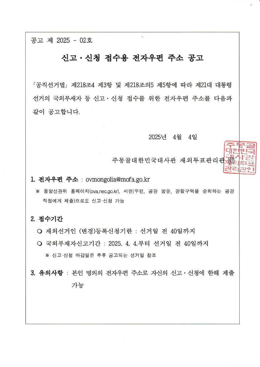주몽골 대한민국 대사관 기관/단체한인 업체 게시판 보기 업소록 소개 기관명 : 주몽골 대한민국 대사관 연락처 (976)7007-1020 영사과 : (976)-7007-1030(비자) 여권, 공증, 영사민원 : 1032 긴급연락처 : (976)7007-1020 일과후/공휴일/주말 : (976)9911-4119 위치 공지사항 제21대 대통령선거 국외부재자 등 신고·신청 일정 및 접수용 전자 우편 주소 공고 작성자 하몽컨텐츠팀 작성일 2025-04-09 11:20 조회 2833 좋아요 2 싫어요 0 인쇄 국외부재자신고-등-안내문-및-신고서.pdf 국외부재자신고-등-안내문-및-신고서.hwp 신고신청-접수용-전자우편-주소-공고.pdf « 2024 하반기 국내청년의 동포기업 인턴십 사업 안내 목록보기 기관/단체 카테고리 The Korean association in Mongolia(몽골 한인회) 연락처 : 1145-0778 기관소개 : 몽골의 한인동포들의 안정적인 사업영위와 몽골 내 입지강화를 위해 일하는 몽골한인회입니다. 주소 : 울란바타르시 바양주르흐구 선진그랜드호텔... 몽 몽골한인상공회의소(KCCIM) 업체명 : 몽골한인상공회의소(KCCIM) 연락처 : (TEL) 7000-4011 / 9696-9815 / 070-7548-1196 이메일 : kccim@hanmail.net 업체소개 : 몽골 한인상공회의소는 교민의...