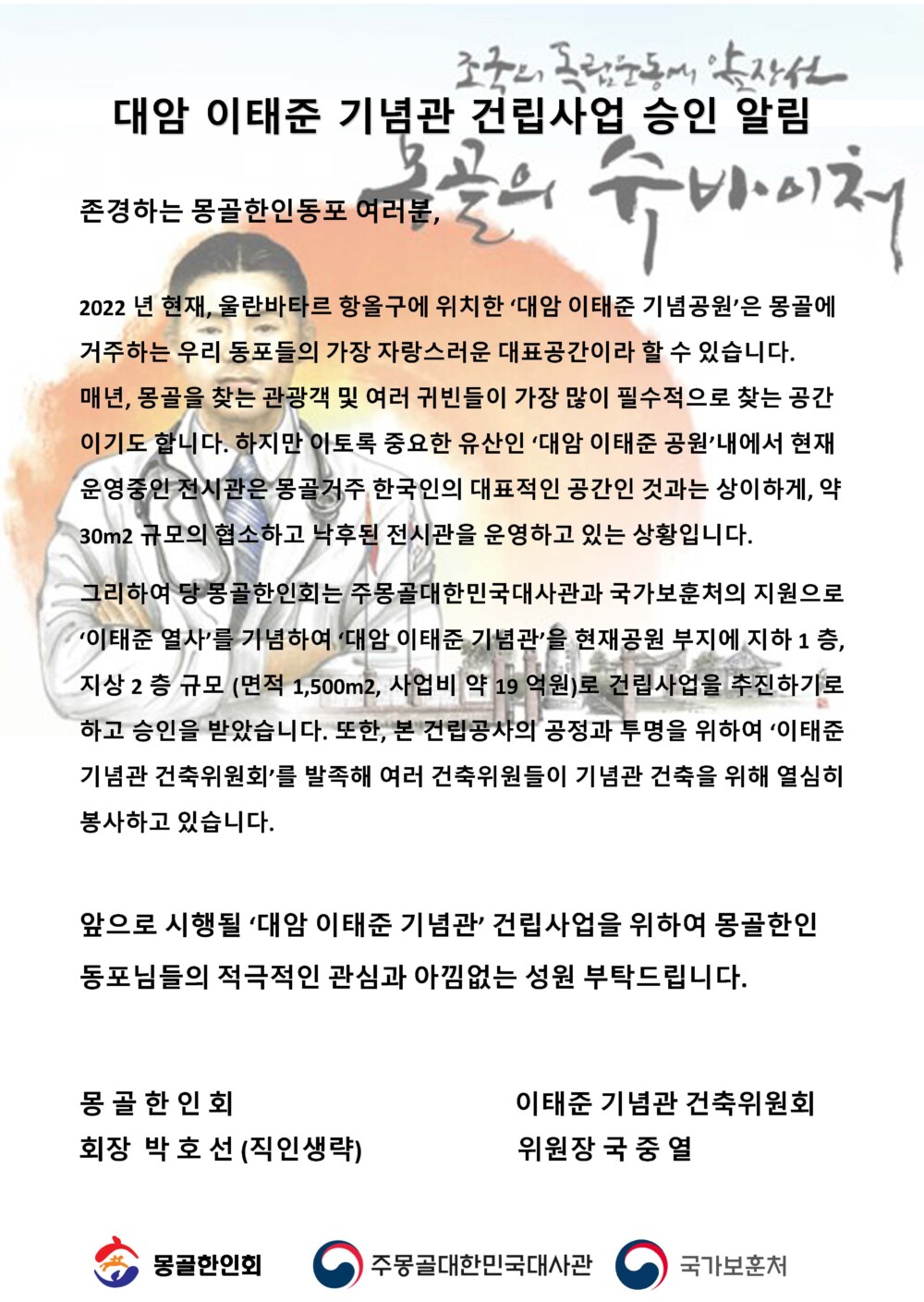 The Korean association in Mongolia(몽골 한인회) 기관/단체한인 업체 게시판 보기 업소록 소개 연락처 : 1145-0778 기관소개 : 몽골의 한인동포들의 안정적인 사업영위와 몽골 내 입지강화를 위해 일하는 몽골한인회입니다. 주소 : 울란바타르시 바양주르흐구 선진그랜드호텔 C동 2층 홈페이지 : 바로가기 + 한인응급구조단 INFO 아가페 병원 대표전화 : 7004-9759 응급 구조단 : 9045-0911 한인응급구조단 응급환자 대상은 대한민국 국민에 한 합니다. 아가페 병원에서는 일반 환자도 진료합니다. 아카페 병원 정보 바로가기 >> 공지사항 대암 이태준 기념관 건립사업 승인 알림 작성자 하몽컨텐츠팀 작성일 2022-05-12 14:30 조회 3696 좋아요 0 싫어요 0 인쇄 « [대한항공] 증편 운항 안내드립니다. 제21회 세계한민족 여성 네트워크(KOWIN) 대회, 국외참가자 신청 안내 » 목록보기 위치 추천 업체 몽 몽골한인상공회의소(KCCIM) 업체명 : 몽골한인상공회의소(KCCIM) 연락처 : (TEL) 7000-4011 / 9696-9815 / 070-7548-1196 이메일 : kccim@hanmail.net 업체소개 : 몽골 한인상공회의소는 교민의... 주몽골 대한민국 대사관 기관명 : 주몽골 대한민국 대사관 연락처 (976)7007-1020 영사과 : (976)-7007-1030(비자) 여권, 공증, 영사민원 : 1032 긴급연락처 : (976)7007-1020 일과후/공휴일/주말 :...