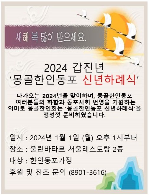 The Korean association in Mongolia(몽골 한인회) 기관/단체한인 업체 게시판 보기 업소록 소개 연락처 : 1145-0778 기관소개 : 몽골의 한인동포들의 안정적인 사업영위와 몽골 내 입지강화를 위해 일하는 몽골한인회입니다. 주소 : 울란바타르시 바양주르흐구 선진그랜드호텔 C동 2층 홈페이지 : 바로가기 + 한인응급구조단 INFO 아가페 병원 대표전화 : 7004-9759 응급 구조단 : 9045-0911 한인응급구조단 응급환자 대상은 대한민국 국민에 한 합니다. 아가페 병원에서는 일반 환자도 진료합니다. 아카페 병원 정보 바로가기 >> 위치 공지사항 몽골 한인동포 신년 하례식 작성자 하몽컨텐츠팀 작성일 2023-12-29 10:25 조회 36287 좋아요 0 싫어요 0 인쇄 « 한인동포 연말 나눔행사 2024년 한인동포한마당 체육대회 » 목록보기 기관/단체 카테고리 주몽골 대한민국 대사관 기관명 : 주몽골 대한민국 대사관 연락처 (976)7007-1020 영사과 : (976)-7007-1030(비자) 여권, 공증, 영사민원 : 1032 긴급연락처 : (976)7007-1020 일과후/공휴일/주말 :... 몽 몽골한인상공회의소(KCCIM) 업체명 : 몽골한인상공회의소(KCCIM) 연락처 : (TEL) 7000-4011 / 9696-9815 / 070-7548-1196 이메일 : kccim@hanmail.net 업체소개 : 몽골 한인상공회의소는 교민의...