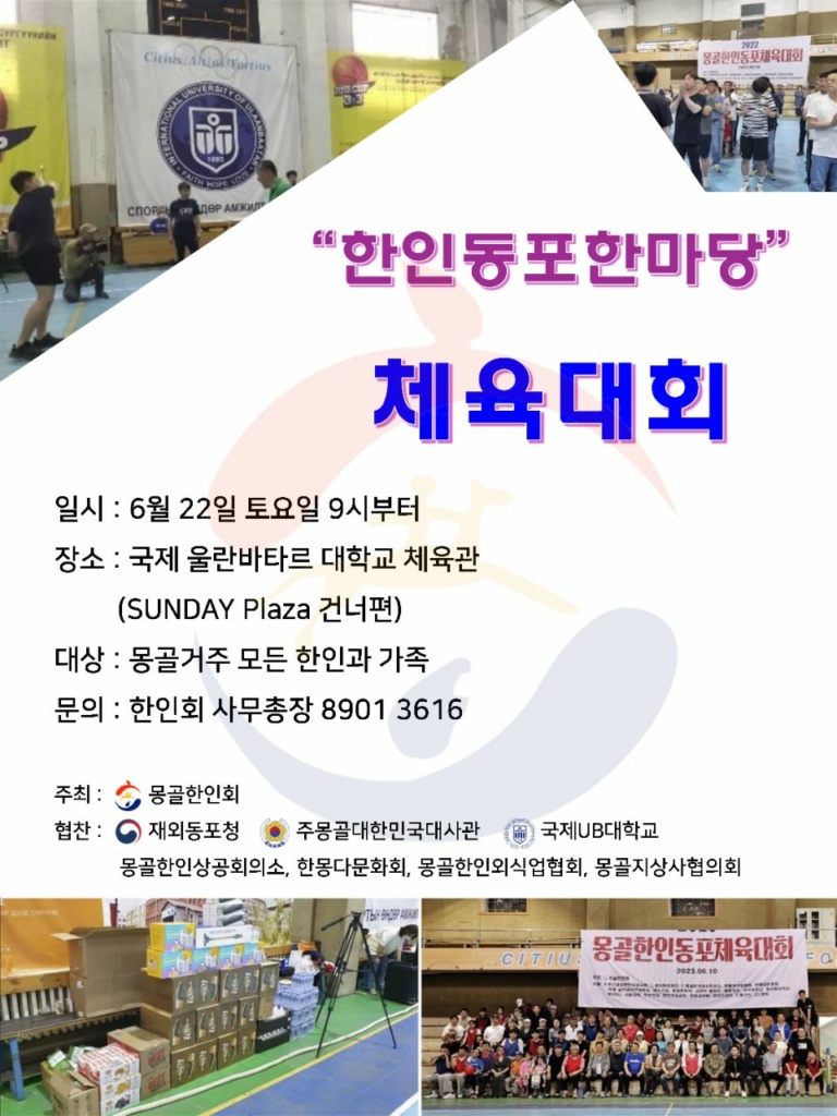 The Korean association in Mongolia(몽골 한인회) 기관/단체한인 업체 게시판 보기 업소록 소개 연락처 : 1145-0778 기관소개 : 몽골의 한인동포들의 안정적인 사업영위와 몽골 내 입지강화를 위해 일하는 몽골한인회입니다. 주소 : 울란바타르시 바양주르흐구 선진그랜드호텔 C동 2층 홈페이지 : 바로가기 + 한인응급구조단 INFO 아가페 병원 대표전화 : 7004-9759 응급 구조단 : 9045-0911 한인응급구조단 응급환자 대상은 대한민국 국민에 한 합니다. 아가페 병원에서는 일반 환자도 진료합니다. 아카페 병원 정보 바로가기 >> 위치 공지사항 2024년 한인동포한마당 체육대회 작성자 하몽컨텐츠팀 작성일 2024-06-05 17:29 조회 22846 2024년 한인동포한마당 체육대회 포스터 좋아요 1 싫어요 0 인쇄 « 몽골 한인동포 신년 하례식 목록보기 기관/단체 카테고리 주몽골 대한민국 대사관 기관명 : 주몽골 대한민국 대사관 연락처 (976)7007-1020 영사과 : (976)-7007-1030(비자) 여권, 공증, 영사민원 : 1032 긴급연락처 : (976)7007-1020 일과후/공휴일/주말 :... 몽 몽골한인상공회의소(KCCIM) 업체명 : 몽골한인상공회의소(KCCIM) 연락처 : (TEL) 7000-4011 / 9696-9815 / 070-7548-1196 이메일 : kccim@hanmail.net 업체소개 : 몽골 한인상공회의소는 교민의...